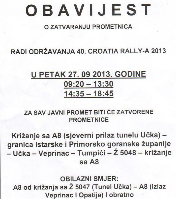 Obavijest o zatvaranju prometnica radi održavanja 40. Croatia rallya 2013.