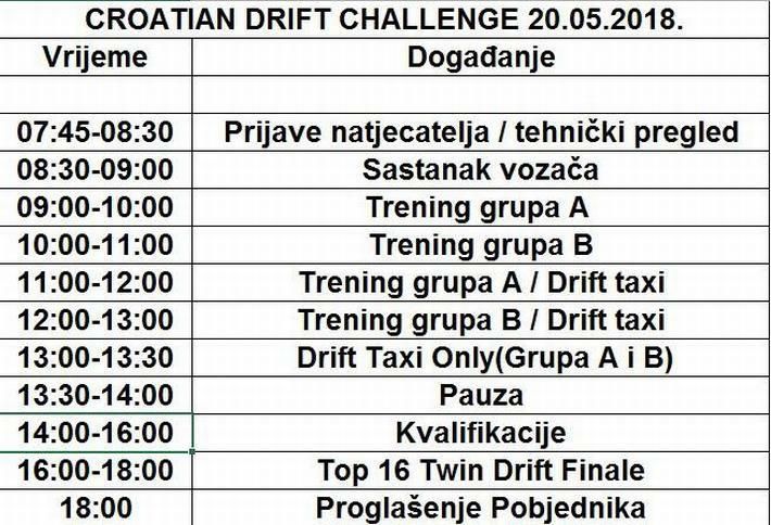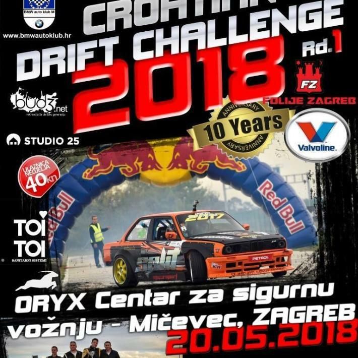 Prva utrka prestižnog Croatian Drift Challenga koji ove godine slavi jubilarnu 10-tu godinu postojanja održati će se 20.5.2018. (Mičevec, Zagreb). Prva utrka sezone održava se u već poznatoj kući drifta “Oryx centru za sigurnu vožnju” u zagrebačkom Mičevcu.