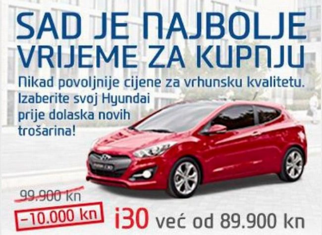 Hyundai je prije dolaska novih trošarina svojim kupcima pripremio akcijsku ponudu modela vrhunske kvalitete dostupnih uz vrlo povoljnu cijenu. Novost u Hyundai akcijskoj ponudi je atraktivna trovratna verzija popularnog modela i30, dostupna po cijeni već od 89.900 kn. Trovratni i30 dolazi s benzinskim 1.4 DOHC motorom sa 100 konjskih snaga, i tri paketa opreme: istart,…