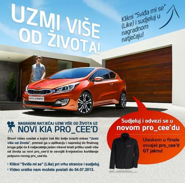 KIA Croatia pripremila je zanimljivunagradnuigru. Stvori video uradak s kojim ćeš što bolje izraziti misao 'Uzmi više od života', prenesi ga u aplikaciju i napreduj do finalnog kruga u kojem će 5 natjecatelja jedan vikend imati priliku uzeti više od života u novom pro_cee’du te osvojiti mogućnost 6-mjesečnog korištenja potpuno novog pro_cee'da. Klikni 'Sviđa mi…