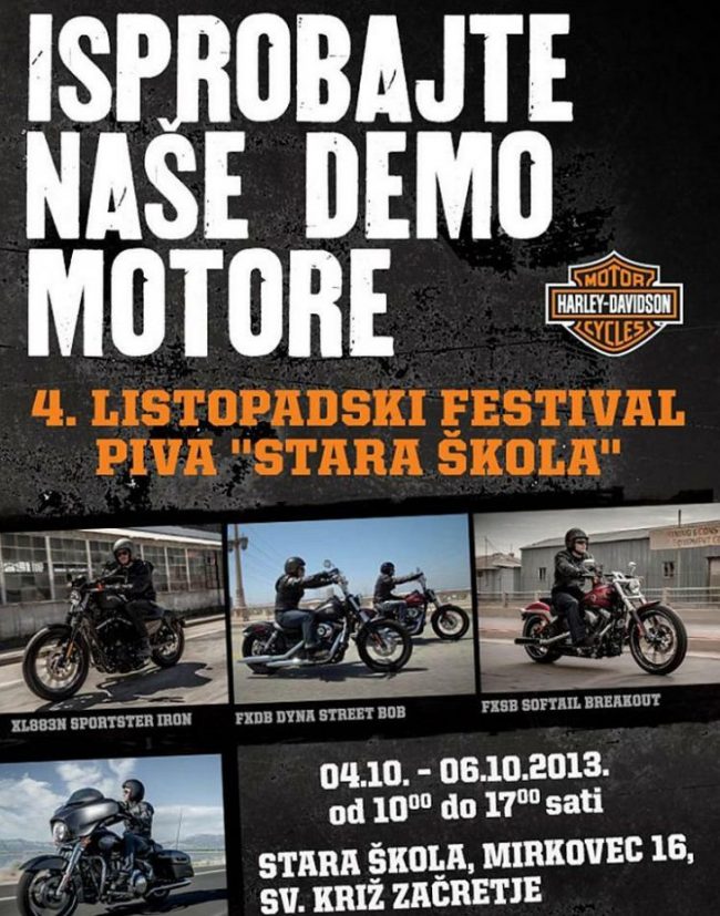 Tvrtka Harley-Davidson Zagreb, ovlašteni distributer vozila marke Harley-Davidson za Republiku Hrvatsku, poziva sve zainteresirane na ‘4. listopadski festival piva – Stara Škola' koji će se održati od 4. do 6. listopada 2013. od 10 do 17 sati u staroj školi, Mirkovec 16, Sv. Križ Začretje. Tvrtka Harley-Davidson Zagreb poziva sve zainteresirane da na tom događaju…