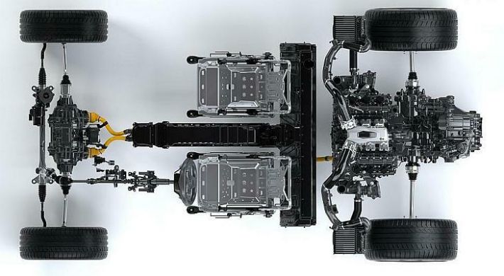 Ostatak hibridnog pogona čini stražnji elektromotor smješten između mjenjača i V6 motora na unutrašnje izgaranje koji ima direktan pogon. Ovaj elektromotor se koristi uglavnom kod ubrzanja, kočenja, te tijekom izmjene stupnjeva prijenosa. Ostatak električnog hibridnog pogona čine dva elektromotora koja pokreću prednje kotače te sudjeluju u dinamičkom sustavu ‘Torque-Vectoring‘ za poboljšanje stabilnosti i upravljanja tijekom vožnje. Točan raspored snage i momenta ovako koncipiranog pogona na sva četiri kotača u ovom trenutku još nije poznat, a pretpostavlja se kako ima ukupno raspoloživu snagu oko 550 KS.