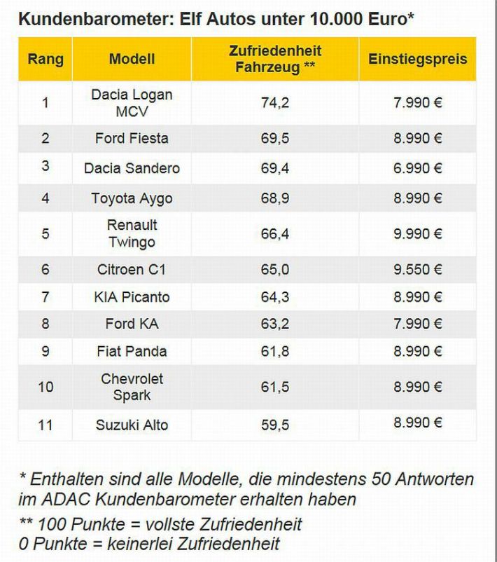 Među automobilima jeftinijima od 10.000 eura njemački su vozači kao najbolji ocijenili Daciju Logan MCV. To je pokazao potrošački barometar njemačkog automobilskog kluba ADAC gdje se članove službeno ispitivalo o zadovoljstvu pojedinim modelima. Dacia Logan MCV popeo se na prvo mjesto ostavivši daleko iza sebe drugoplasiranog. Na treće se mjesto uvrstio Dacia Sandero, a na peto Renault Twingo. Za potrebe potrošačkog barometra, njemački automobilski klub ADAC s više od 20 000 članova, putem interneta se raspitivao o njihovu iskustvu i zadovoljstvu automobilom koji posjeduju. Potrošači su ocjenjivali ne samo zadovoljstvo automobilom, nego i kvalitetu post-prodajnih usluga te najavljivali svoje buduće planove za kupnju vozila, Više informacija pročitate na linku Dacia Logan MCV.