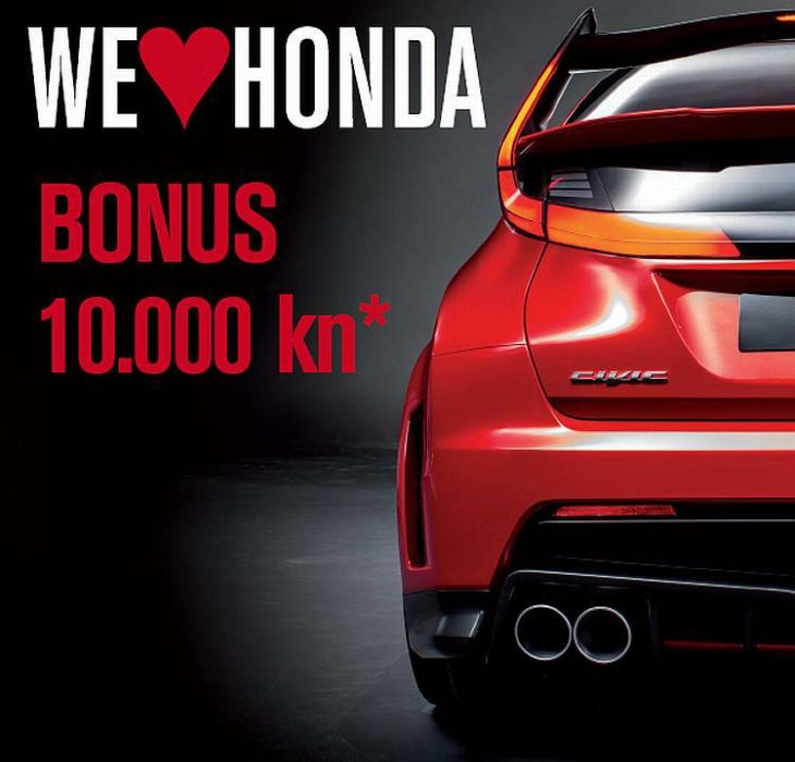 Uz beskompromisnu kvalitetu, pouzdanost i eleganciju modela Honda Civic, Honda je odlučila obradovati sve kupce fantastično štedljivog i odlično ocijenjenog diesel 1.6 i-DTEC modela po principu kupovine ''staro za novo''. Naime, prilikom otkupa Vašeg rabljenog vozila, Honda će vrijednost Vašeg rabljenog vozila uvećati za 10.000 kuna. Za navedeni bonus se raspitajte u ovlaštenim Honda prodajnim centrima. Akcijska ponuda traje do 23.05.2014. ili do isteka zaliha. Više informacija na http://www.honda.hr.