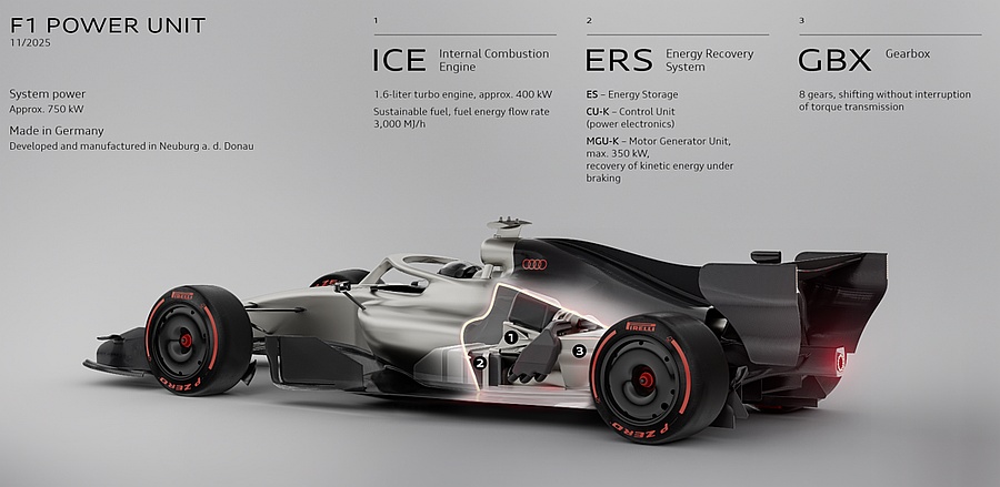 NAPOMENA: Audi će u Formulu 1 prvi put ući 2026. s vlastitom tvorničkom momčadi i hibridnim pogonskim sustavom („pogonskom jedinicom“) razvijenim u Njemačkoj. Buduća momčad bazirana je na tri lokacije: Audi Formula Racing GmbH, društvo osnovano posebno za ovaj projekt, razvija pogonsku jedinicu u Neuburgu an der Donau. Hinwil u Švicarskoj bit će dom za razvoj trkaćeg automobila, kao i za planiranje i vođenje utrka. Osim toga, britanski tehnološki ured u Bicesteru pruža uporište u srcu „Doline motosporta“, nudeći izravan pristup vrhunskim F1 talentima i ključnim strateškim partnerima. Dodatni odlučujući faktor za uključivanje marke Audi u Formulu 1 novi su propisi FIA-e koji će od 2026. uključivati održiva goriva i povećati električni udio hibridne pogonske jedinice na gotovo 50 posto.
