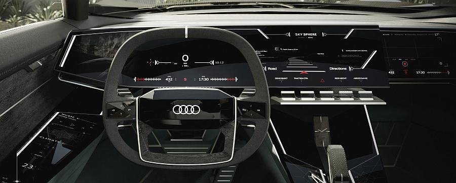 Kad su u pitanju tri nadolazeća konceptna vozila, Audi skysphere, Audi grandsphere i Audi urbansphere, marka prostor koji okružuje putnike (“sfera”) i koji za njih postaje iskustvo – unutrašnjost – stavlja u središte svoga dizajna. To je zato što su sva tri vozila dizajnirana za autonomnu vožnju razine 4 – što znači da u određenim definiranim situacijama na cesti i u prometu vozač može prenijeti potpunu odgovornost na vozilo i više ne mora intervenirati. Iz tog se razloga upravljački elementi poput kola upravljača i papučica mogu zakrenuti u nevidljiv položaj i tako potpuno ukloniti iz unutrašnjosti. A putnici, uključujući i onoga na prednjem lijevom sjedalu, mogu uživati u novom obliku slobode – slobodi opuštanja na otvorenom, uživanju u krajoliku i vjetru ili u interakciji s internetom i svijetom zahvaljujući povezanosti sa digitalnim ekosustavu u modelu Audi skysphere.