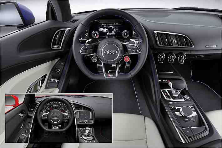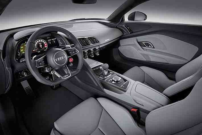 Sve funkcije su orijentirane prema vozaču i omogućuju lako upravljanje čak i tijekom vožnje na granici izlijetanja – i to sve bez potrebe da vozač skida ruke s upravljača. Novo konstruirana sportska sjedala s integriranim naslonima za glavu osiguravaju izvrsnu bočnu podršku. Još radikalniji oblik sjedenja za neki sportski automobil dolazi u obliku novo razvijenih R8 školjkastih sjedala. Ona jasno predstavljaju vezu između lagane konstrukcije i udobnosti (opcija u izvedbi V10 i standardni dio opreme u izvedbi V10 plus). Start-stop tipka i tipka Audi drive select sustava nalaze se na nekoliko satelita na novom višenamjenskom plus upravljaču. Performance upravljač u Audiju R8 V10 plus uključuje dva dodatna satelita. Jedna tipka služi za performance način rada zajedno s rotacijskim prekidačem za odabir programa za suho, mokro i snijeg, kao i tipku za kontrolu sportskog ispušnog sustava. Audijev virtualni kokpit ugrađen je u samostojeće kućište i prikazuje sve informacije na 12,3 inčnom zaslonu s razrađenom računalnom, fascinantnom grafikom. Vozač se može prebacivati između različitih režima prikaza i također može u individualnom načinu rada namještati raspored instrumenata prema svojim potrebama. U performance načinu rada vozaču se prikazuju informacije o programima vožnje, ubrzanju, usporavanju i poprečnim silama kao i snazi i okretnom momentu. Audi virtualni kokpit također prikazuje indikator prebacivanja prijenosnih stupnjeva koji vozača informira da je broj okretaja motora došao do svoje granice. Vozač upravlja Audijevim virtualnim kokpitom koristeći višenamjenski plus upravljač. Ruke vozača ostaju na upravljaču i može se koncentrirati na cestu. Alternativno, ova operacija se može provesti uz pomoć na dodir osjetljivog kotačića ili tipki na središnjoj konzoli. Što se tiče dizajna unutrašnjosti, napete geometrijske linije naglašavaju estetsku laganu konstrukciju ove marke. Njegov karakteristični element je 'monoposto', veliki luk u području oko sjedala vozača. MMI ekran iz prethodnog modela više nije dostupan. Umjesto njega ugrađena su tri središnja kontrolna elementa klima uređaja. Trodimenzionalni dizajn usisnika zraka podsjeća na usisnike zraka trkaćeg automobila, a čini se kao da prednja ploča lebdi. Široka konzola središnjeg tunela uključuje standardno MMI sučelje, kao i novo-dizajniranu ravnu glavu ručice S tronic mjenjača. Što se tiče presvlaka, klijenti mogu birati između Alcantara/Pearl Nappa kože i fine Nappa kože. Također su dostupni elementi obloga od sjajnih ugljičnih vlakana, dva kožna paketa i novi vez u obliku dijamanta.