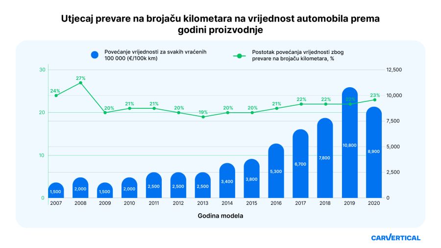 Vozači preferiraju automobile s manjom kilometražom, očekujući da će biti u boljem stanju i da neće zahtijevati velike popravke. Može biti teško pronaći kupca za automobil s velikom kilometražom, osim ako je cijena znatno niža. Zbog toga prodavači s lošim namjerama vraćaju kilometražu automobila, čime umjetno napuhavaju njegovu cijenu i ostvaruju više profita. Automobili s izmijenjenom kilometražom u prosjeku se prodaju za nevjerojatnih 21 % više. To znači da hrvatski vozači mogu platiti i za petinu više nego što vozilo zapravo vrijedi, i tako gube tisuće eura.