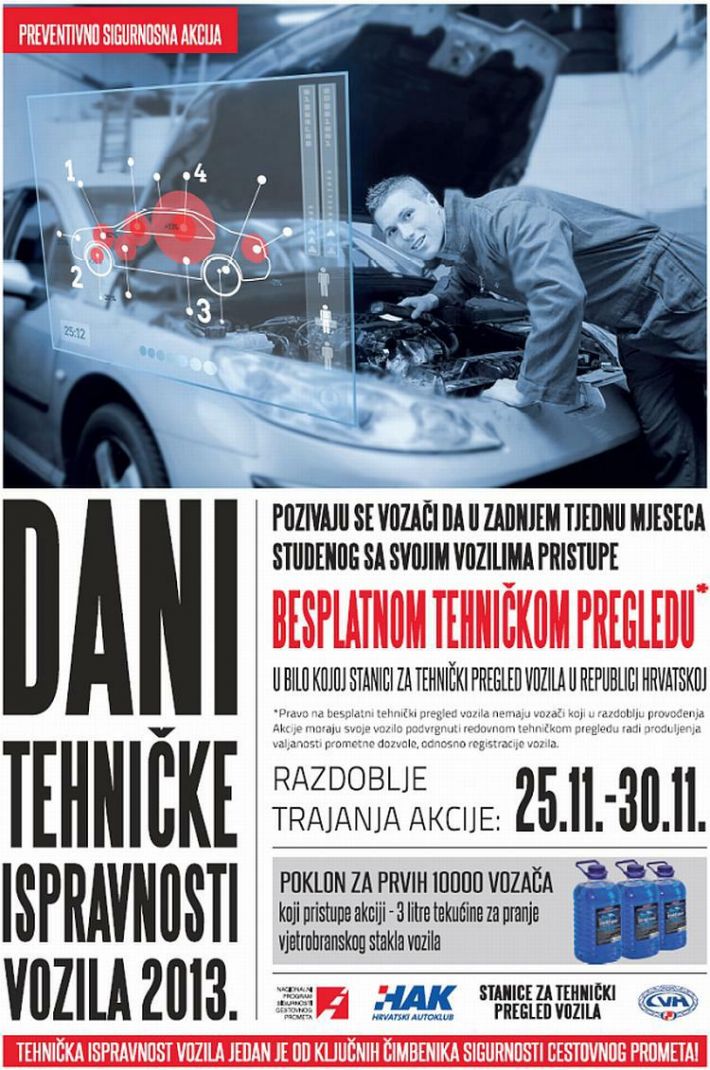 U posljednjem tjednu studenog održat će se tradicionalna akcija Dani tehničke ispravnosti vozila. HAK poziva vozače na besplatan preventivni pregled vozila od 25. do 30. studenog u svim stanicama za tehnički pregled vozila. Hrvatski autoklub najavljuje održavanje tradicionalne besplatne, edukativne, preventivno-sigurnosne akcije “Dani tehničke ispravnosti vozila 2013.”, koju zajednički provode stanice za tehnički pregled vozila i stručne organizacije, Hrvatski autoklub i Centar za vozila Hrvatske te Ministarstvo unutarnjih poslova, pod pokroviteljstvom Nacionalnog programom sigurnosti cestovnog prometa.
