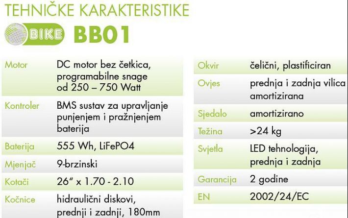 Rama (okvir) bicikla dostupan je u veličinama od 40 do 56 cm. Bicikl je težak oko 24 kg. Vožnjom samo na struju do brzine 25 km/h doseg je oko 40 km, a vrijeme punjenja baterije je oko dva sata. Vožnjom na struju trebate manje od 1 kune na svakih 100 km. Plan prodaje do kraja 2012. godine je 2000 električnih bicikala Bioplanet Bike. Konstrukcija hrvatskog električnog bicikla izvedena je u Slavonskom Brodu, a sklapa se u Zagrebu. Jamstvo na bicikl je dvije godine, a više informacija potražite na http://www.bioplanetbike.com. Hrvatski bicikl Bioplanet Bike u svijetu se prodaje po cijeni 1499 eura, a u Hrvatskoj ima cijenu od 13.990 kuna. (dvk)