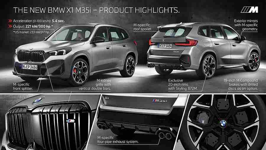 Novi BMW X1 M35i xDrive izdvaja se od svojih stabilnih kolega u liniji kompaktnih SAV-ova ne samo zbog svojih superiornih performansi, već i zbog svog prepoznatljivog dizajna. M-specifični dizajnerski detalji odražavaju elitni sportski karakter novog vrhunskog modela s intenzitetom bez premca u bilo kojem prethodnom modelu performansi tvrtke BMW M GmbH. Unutrašnjost novog BMW X1 M35i xDrive već nudi zadivljujući sportski ugođaj u svojoj standardnoj specifikaciji, a njegova prepoznatljiva aura može se dodatno poboljšati s ekskluzivnim opcijama kao što su M Sport sjedala. Sadržaj specifičan za M na BMW zakrivljenom zaslonu – potpuno digitalna skupina zaslona koju čine informacijski zaslon od 10,25 inča i kontrolni zaslon s dijagonalom zaslona od 10,7 inča – izoštrava vozačev fokus na sportsko iskustvo vožnje. Dodano tome, najsnažnija varijanta kompaktnog SAV-a također se može specificirati s gotovo punim rasponom opcija koje se nude za BMW X1 kada se radi o optimiziranju užitka u vožnji, udobnosti i individualnosti. Samostalni dizajn s poznatim M detaljima: M bubrežasta rešetka s vodoravnim dvostrukim prečkama, M poklopci vanjskih retrovizora, kvartet ispušnih cijevi.