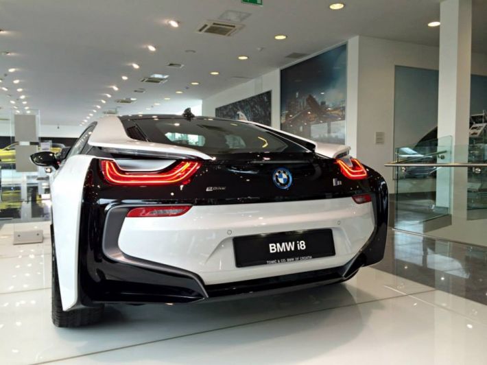 Struja, struja, struja svuda oko nas… Tako se sve češće pijeva u automobilskom svijetu i među kupcima s debljim novčanicima. Već smo puno pisali o hibridnom automobilu koji dolazi iz Bavarske, a ime mu je BMW i8. Oni koje taj automobil zanima, bilo da ga žele kupiti ili samo razgledati, to sada mogu učiniti u živo, jer je BMW Hrvatska dovela u našu zemlju hibridni BMW i8 koji je izložen u autosalonu Tomić&Co u Zagrebu. Što reći o BMW i8? Samo da dodamo kako su vrata BMW-a i8 napravljena od plastike ojačane karbonskim vlaknima (CFRP) i aluminija, te su lakša za 50% od uobičajenih automobilskih vrata. Ovo prilikom nećemo zamarati tehničkim podacima, već ostavljamo da uživate u fotografijama izloženog modela BMW i8. Prava poslastica čeka vas u zagrebačkom salonu Tomić&Co. BMW i8 smatraju najprogresivnijim sportskim automobilom, a najbolje ga je opisala Loyka Love na Facebooku – ‘A što reći? Speechless!’