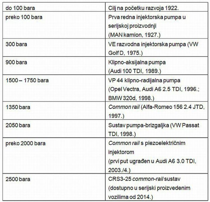 Često se postavlja pitanje zašto viši tlak ubrizgavanja štedi gorivo i povećava učinkovitost i okretni moment kod dizelskih motora. Očekuje se kako će tijekom sljedećeg desetljeća velika većina dizelskih motora raspolagat tlakom ubrizgavanja od otprilike 2000 bara. Iako 3000 bara nije nezamislivo, bit će ograničeno na trkaće automobile i dizelske motore visoke učinkovitosti. Common-rail dizelski sustav Bosch ima u sebi ugrađen piezoelektrični injektor za osobna vozila koji radi na tlaku ubrizgavanja od 2500 bara. Svojim višim tlakom ubrizgavanja novi piezoelektrični modeli iz Boscha svrstavaju se u sam vrh tehnološkog razvitka. Optimizirani sustav ubrizgavanja goriva atomizira gorivo u još sitnije kapljice te pospješuje izgaranje. Manja potrošnja samo je jedna od prednosti ove tehnologije. Za usporedbu, tlak koji stvara common-rail sustav je otprilike jednak tlaku koji bi nosorog od 2.000 kilograma stvorio kada bi stao na površinu veličine nokta. Stlačeno gorivo nakon toga fino se raspršuje pri brzini nadzvučnog mlažnjaka.