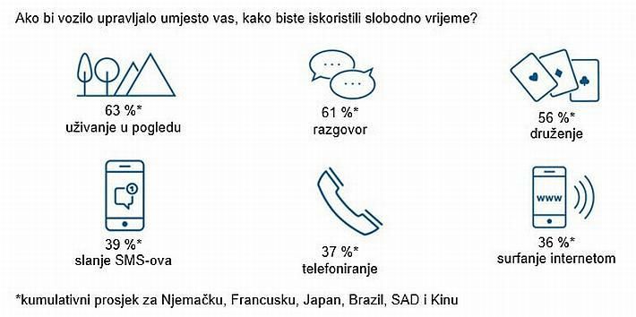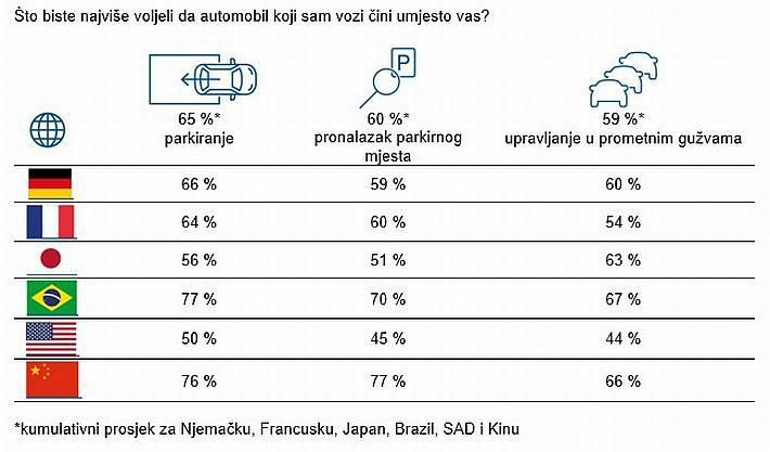 Za samo nekoliko godina automobili s automatiziranom vožnjom bit će uobičajena pojava na cestama. Ispitanici se uglavnom nadaju da će automatizirana vožnja značiti više udobnosti i znatno manje stresa za upravljačem. Automobil budućnosti – koji će u potpunosti poštedjeti vozače potrebe za upravljanjem, dodavanjem gasa i kočenjem – prvenstveno se smatra korisnim za duge relacije (67 %) i putovanja na godišnji odmor (61 %). Većina ispitanika očekuje znatan porast praktičnosti (68 %) i sigurnosti (60 %) u mnogim svakodnevnim situacijama poput traženja parkirnog mjesta u gradovima. Anketom je također utvrđeno zanimljivo rangiranje najpoželjnijih funkcija automatizirane vožnje: vrlo često navodilo se parkiranje (65 %), ali i automatizirano traženje parkirnog mjesta u središtu grada (60 %) te opuštena vožnja tijekom prometnih gužvi (59 %).
