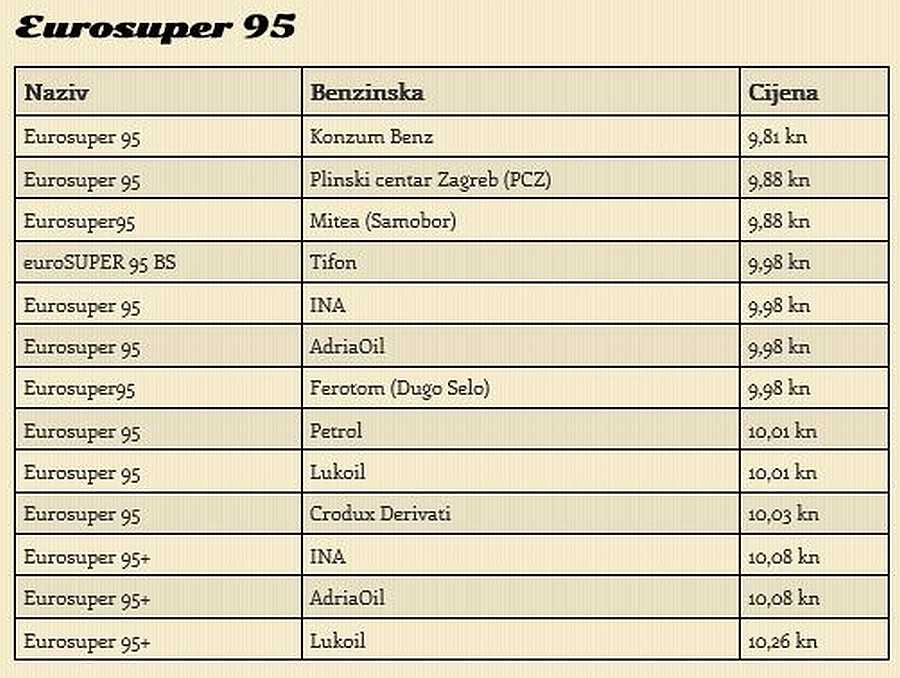 cijena Eurosupera 95 kreće se od 9,81 do 10,26 kuna za litru