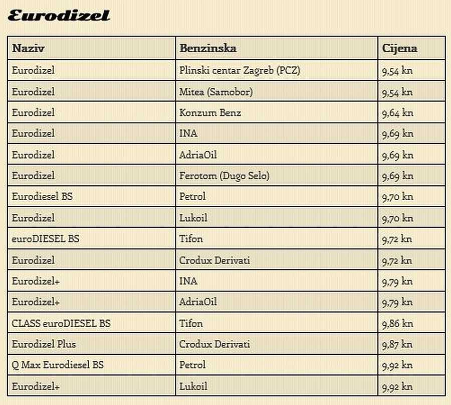 cijena Eurodizela kreće se od 9,54 do 9,92 kuna za litru
