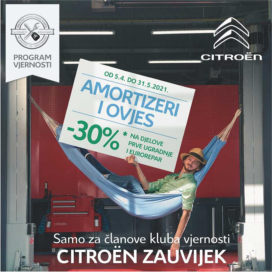 Citroën je pripremio proljetnu servisnu akciju za članove kluba vjernosti Citroën Zauvijek do 31. svibnja 2021. Uz standardne popuste koje ostvaruju članovi kluba na dijelove za održavanje, članovi sada ostvaruju poseban popust od 30 % na prednje i stražnje amortizere kao i dijelove ovjesa. Kako bi vlasnici vozila uživali u svakoj vožnji, besprijekorni amortizeri su posebno bitni. Njihovo prirodno trošenje kroz vrijeme ima štetne posljedice za udobnost, a izričito i za sigurnost jer osiguravaju držanje kotača u kontakt sa tlom bez obzira na uvjete na cesti. Tijekom 20.000 prijeđenih kilometara barem milijun puta upijaju udarce, stabiliziraju svaki kotač i omogućuju normalni rad opruge. Osim o kilometrima, njihovo trošenje ovisi o težinu vozila i stanju ceste. Iako postoji znakovi upozorenja (teško upravljanje u krivinama, gubitak prianjanja prilikom ubrzanja, udarci kod prijelaza na neravninama) pojavljuju se uglavnom prekasno, kad je put zaustavljanja već produžen do 35%, osjetljivost na aquaplanning povećana do 15% i Vaše gume se troše do 25% brže. Neispravan ovjes je u Hrvatskoj treći razlog pada na tehničkom pregledu.