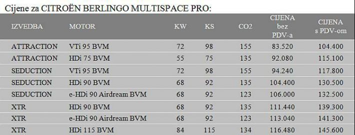 Citroën Berlingo Multispace PRO već u serijskoj opremi Attraction ima ABS s elektroničkim razdjelnikom kočenja (REF) i pomoć pri naglom kočenju (AFU), desna bočna klizna vrata, bočna stakla koja se mogu odškrinuti u 2. redu, električne podizače prednjih stakala, klupu 40/60, ostakljena dvokrilna stražnja vrata s brisačem i grijačem, plastičnu podnicu prtljažnog prostora koja se može skinuti, progresivni servo upravljač, upravljač podesiv po visini i dubini, zračni jastuk za vozača i suvozača i dr. Berlingo Multispace PRO se registrira za 4 osobe, sadrži naknadno ugrađenu fiksnu pregradnu stijenu i atest kao lako gospodarsko vozilo. Cijena prerade s ugradnjom i atestom iznosi 3.650 HRK + PDV i nije uračunata u gore navedenu cijenu vozila.