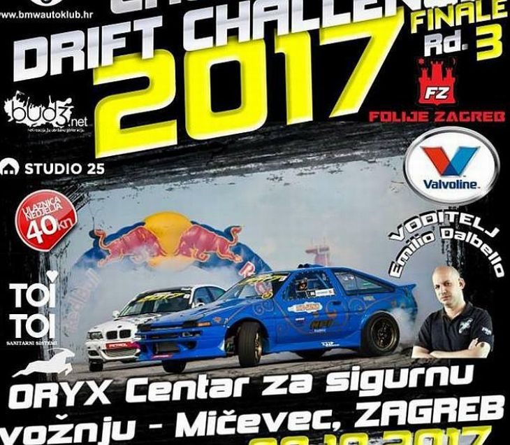 U Mičevcu kraj Zagreba, 8.10.2017. održava se od 9 do 18 sati treća i posljednja utrka ovogodišnjeg Croatian Drift Challengea. Finale CDC -a bit će obilježeno borbom za prvaka sezone 2017. Nekoliko vozača je bodovno u borbi za ukupnog pobjednika. Hoće li to biti Clemens Kauderer koji je vodeći u prvenstvu ili Goran Šorak koji trenutačno drži drugo mjesto na rang ljestvici? Posljednja trka će također biti i najuzbudljivija, jer se vozi standardni layout (brži) pa će twin dueli biti više nego uzbudljivi. Dođite i podržite vozače u borbi za titulu najboljeg!!