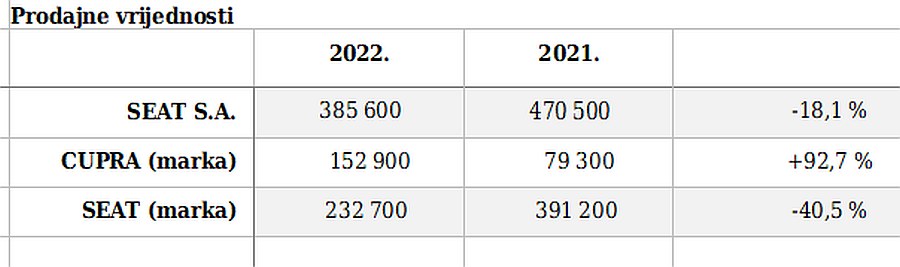 Nezaustavljivi impuls marke CUPRA nastavio se i u 2022. godini s rekordnom isporukom od 152 900 vozila, što je porast od 92,7 % u usporedbi s prethodnom godinom (79 300 vozila). Rezultati su potaknuli financijski zaokret tvrtke u godini koja je bila obilježena trajnom nestašicom poluvodiča i ostalih ključnih dijelova. Ukupno je gledano društvo SEAT S.A. 2022. godinu zaključilo s 385 600 isporučenih vozila, što predstavlja smanjenje od 18,1 % u usporedbi s 2021. godinom (470 500 vozila) kao rezultat tih nestašica.