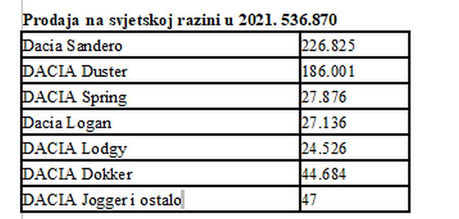 Dacia SANDRERO prodan je u 226.805 primjerka u 2021., pri čemu gotovo 90 % prodaje otpada na treću generaciju modela. Sandero je i u 2021. godini bio vodeći model na europskom tržištu privatnih kupaca, što je peta godina zaredom otkako zauzima taj položaj. U nekim je zemljama Sandero najprodavaniji automobil u svim kategorijama kupaca, što ga čini drugim najprodavanijim automobilom u Europi. Za njim ne zaostaje ni Duster koji od 2018. godine nosi titulu najprodavanijeg SUV-a na tržištu privatnih kupaca. S ukupno 186.001 prodanih primjeraka u 2021., prodaja Dustera dosegla je brojku od 2 milijuna otkako je predstavljen 2010. godine. Model čija je službena prodaja počela u ožujku, Dacia Spring, već je ostvario uvjerljiv uspjeh na tržištu električnih automobila s 27.876 prodanih primjeraka i više od 46.000 narudžbi zaprimljenih do kraja 2021. Dizajniran da učini električne automobile što pristupačnijima za svakodnevnu upotrebu, Spring je postao mjerilo na brojnim tržištima, a čak se 80 % kupaca Springa upravo zbog njega po prvi put odlučilo kupiti neko vozilo marke Dacia.