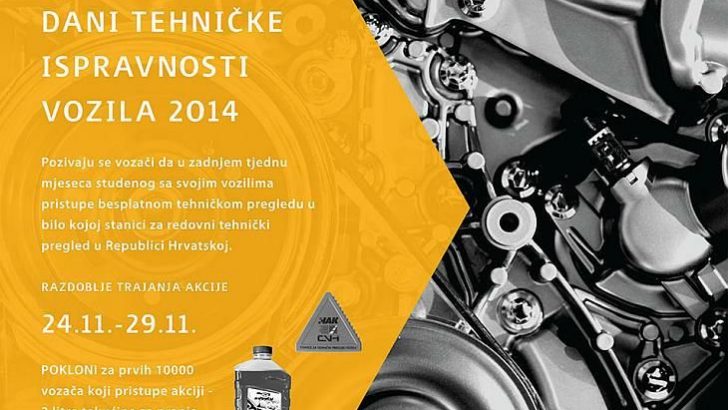 Od 24. do 29. studenog održava se tradicionalna preventivno sigurnosna akcija „Dani tehničke ispravnosti vozila 2014.“ Hrvatski autoklub poziva vozače na provjeru tehničkog stanja vozila sudjelovanjem u tradicionalnoj besplatnoj, edukativnoj, preventivno-sigurnosnoj akciji “Dani tehničke ispravnosti vozila 2014.”, koju sljedećeg tjedna zajednički provode stanice za tehnički pregled vozila i stručne organizacije, Hrvatski autoklub i Centar za vozila Hrvatske te Ministarstvo unutarnjih poslova, pod pokroviteljstvom Nacionalnog programom sigurnosti cestovnog prometa. Akcija počinje u ponedjeljak 24. studenog i završava u subotu 29. studenog 2014. i provodi se na cijelom teritoriju Republike Hrvatske. U sklopu akcije vozači mogu obaviti besplatan tehnički pregled vozila, u svih 159 redovnih stanica za tehnički pregled vozila. U HAK-u napominju kako se ova dragovoljna akcija ne odnosi na vozače koji u razdoblju njenog provođenja svoje vozilo moraju podvrgnuti redovnom tehničkom pregledu radi produljenja valjanosti prometne dozvole odnosno registracije vozila. Cilj akcije je skrenuti pozornost vozačima na važnost tehničke ispravnosti vozila u kontekstu cestovne sigurnosti, jer je vozilo, uz vozača i cestu, ključan čimbenik te sigurnosti. Tehnička ispravnost velikim dijelom ovisi o načinu na koji se vozači i vlasnici vozila odnose prema automobilima i koliko u njih ulažu.