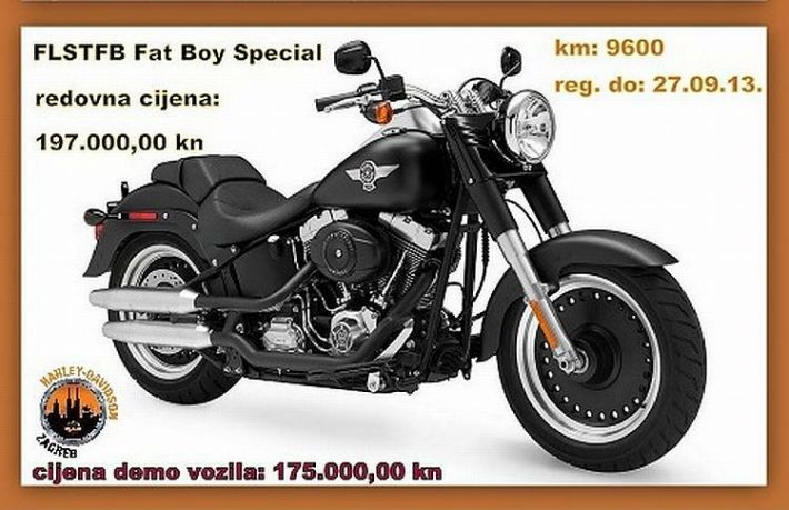Prvi u ponudi je motocikl Harley Davidson XL883R Sportster Roadster koji je prošao samo 3.200 km i registiran je do 22.2.2014. godine. Cijena novog je 79.900 kuna, a cijena demo vozila je 71.500 kuna. Drugi u ponudi je motocikl Harley Davidson FLSTFB Fat Boy Special koji je prošao 9.600 km i registiran je do 27.9.2013. godine. Cijena novog je 197.000 kuna, a cijena demo vozila je 175.000 kuna. Više informacija na web stranici http://www.harley-davidson-zagreb.hr.