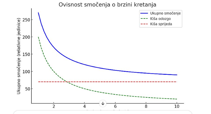 – Plava linija (ukupno močenje) pokazuje da što brže osoba trči, to se manje smoči – iako kiša sprijeda raste, smanjenje odozgo dominira.