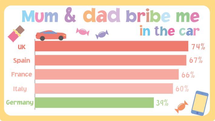 Kad je riječ o „dovođenju djece u red“ 26% mališana svjedoči kako im mame i tate tijekom putovanja daju pametne telefone da bi se smirili, najviše u Velikoj Britaniji (32%), a najmanje u Njemačkoj (17%). Britanci će zabaviti djecu nudeći im hranu i grickalice (29%) ili pak prijetnjama (15%). Navodno se najbolje ponašaju djeca u Njemačkoj, čak njih 38% tvrdi da ih roditelji ne moraju opominjati za ponašanje u automobilu.