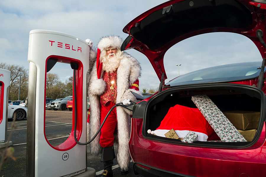 – Djed Božićnjak uočen je kako puni svoj novi Tesla Model 3 dok se priprema za najprometnije doba godine