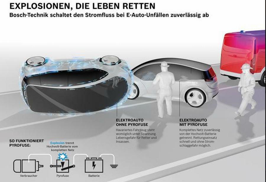 Uz sve više električnih automobila na cesti, mnogi vozači više nisu sigurni što bi trebali učiniti ili ne učiniti u slučaju sudara. Električni motori također predstavljaju veliki problem i izazpv za spasioce. U stvari, kao i bilo koja druga vozila, električna vozila su opremljena sigurnosnim sustavima za takve događaje. Na primjer, Bosch poluvodiči pomažu u sprečavanju rizika od električnog udara nakon nesreće. Posebno dizajnirani mikročipovi deaktiviraju strujne krugove vozila u djeliću sekunde. To omogućuje spasiocima siguran pristup, te osigurava kako hitna pomoć i putnici u vozilu ostanu na sigurnom. “Naša tehnologija poluvodiča igra vitalnu ulogu u sigurnosti hibridnih i električnih vozila”, kaže Jens Fabrowsky, član izvršnog rukovodstva Bosch odjele za automobilsku elektroniku. Bosch proizvođačima vozila isporučuje poluvodičke čipove za ugradnju u posebne sustave koji sigurno isključuju akumulator u slučaju sudara. “Suočeni sa sve većim brojem električnih vozila koja bi mogla biti uključena u sudare, takvi su sustavi apsolutno neophodni ako želimo ispuniti svoju misiju pomoći i spašavanja žrtava prometnih nesreća što je brže i sigurnije”, dodaje Karl-Heinz Knorr , potpredsjednik Njemačke vatrogasne udruge (DFV).