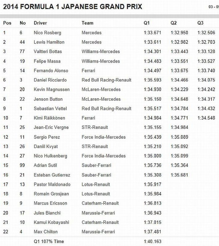 Kvalifikacija za VN Japana na stazi Suzuka prošla je bez problema po novom asfaltu,te suhom i sunčanom vremenu, a najavljivani tajfun za sada je promašio stazu. Nico Rosberg u Mercedesu uzeo je pole position na VN Japana za 0,197 sekundi ispred Lewis Hamiltona. No, krenimo redom. U prvoj rundi kvalifikacija otpala su oba bolida momčadi Marussia (Bianchi, Chilton), Caterham (Kobayashi, Ericsson) i Lotusa (Maldonado, Grosjean). Vozači koji su otpali startaju s ovih pozicija: 17) Pastor Maldonado, 18) Romain Grosjean, 19) Marcus Ericsson, 20) Jules Bianchi, 21) Kamui Kobayash,i 22) Max Chilton