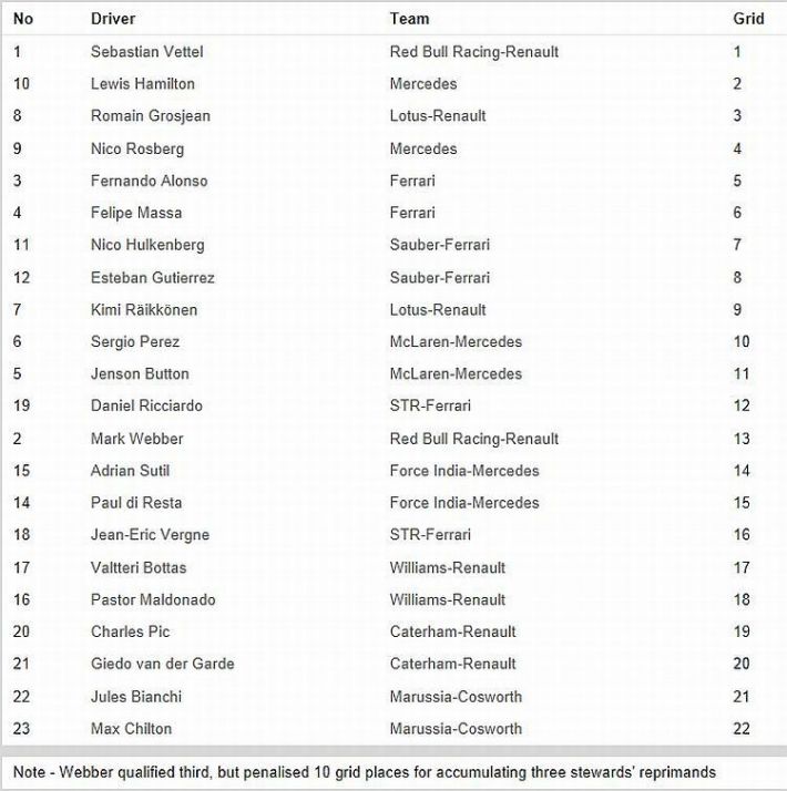 Odličan Sebastian Vettel u fenomenalnom bolidu Red Bulla nastavlja svoj brilijantan niz. Premda je na treninzima Hamilton sa svojim Mercedesom bio jako brz i svi su se nadali kako će tu brzinu pokazati i u kvalifikacijama, čudo se nije dogodilo. Vettel je opet u kvalifikacijama pokazao da je najbrži i to osjetno od konkurencije, te je dohvatio svoj šesti pole position ove sezone, svoj 42. u karijeri. Da bolid Rad Bulla radi savršeno potvrdio je i Mark Webber osvojivši treće mjesto u kvalifikacijama, ali je kažnjen sa 10 mjesta manje, kazna koja je rezultirala opomenom, trećom u nizu na utrci u Singapuru, a kazna ga je dočekala u Koreji, pa Weber starta tek kao 13. Hamilton u Mercedesu starta drugi, a iza njega kao treći Grosjean (Lotus) i Rosberg u Mercedesu. Ferrarijav dvojac Alonso i Massa parkirali su se na startnom poretku tek kao peti i šesti, ponovo pokazujući nemoć Ferrarijevog bolida. Iza dva Ferrarija još su dva bolida koje pokreće Ferrarijev motor – dva Saubera (Hulkenberg i Gutierrez) što je za njih dobar rezultat. Kao deveti će u utrku startati Raikkonen, a dva McLarena startaju nisko, kao deseti i jedanaesti (Perez ispred Buttona). Zadnjih šest pozicija na startu drže najsporiji bolidi Marussije i Caterhama, a od najsporijih su najbrži bolidi Williamsa,što je definitivno još jedno razočarenje u nizu za ovu momčad.