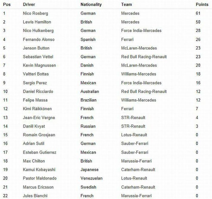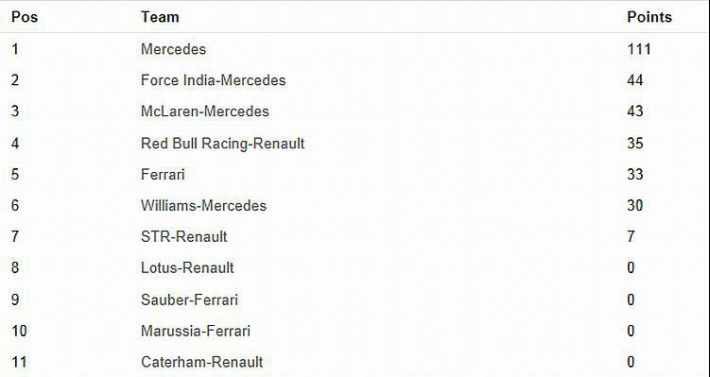 Mercedesovi pogonski sklop radi savršeno i zajedno s Mercedesovom šasijom čini za sada nepobjediv stroj, a Mercedesove pogonske jedinice odlično rade i u bolidima drugih momčadi. Dokaz za to je i osvojeno visoko treće mjesto Pereza u Force Indiji, a Force India ima i drugi bolid (koji vozi Hulkenberg) plasiran na petom mjestu, te je kao takav po uspješnosti u ovoj utrci odmah iza Mercedesa. Veći dio utrke do izlaska sigurnosnog automobila odlično su stajali u samom vrhu poretka bolidi Williamsa, Bottas i Massa, da bi poslije povlačenja sigurnosnog automobila pali u poretku, ali i ovaj put je na kraju Massa bio brži od Bottasa, te su oba Williamsova bolida osvojili na kraju pomalo razočaravajuće sedmo i osmo mjesto u odnosu na pokazano u većem dijelu utrke. Uzrok tome su i naglo probuđeni bolidi Red Bulla po izlasku sigurnosnog bolida, jer dobro su u momčadi i vozači osjetili kako bi u sprintu zadnjih 10 krugova mogli značajno popraviti inače blijedo izdanje u utrci. I u tom su uspjeli. Na kraju Ricciardo je opet bio vidno brži od Vettela kojega je uspio prijeći u utrci, a Red Bullovi bolidi su na kraju osvojili četvrto i šesto mjesto. Alonso i Raikkonen sigurno neće biti zadovoljni svojim bolidom i osvojenim devetim i desetim mjestom, što je potvrdilo kako su ispred njih Mercedes, Force India, Red Bull i Williams, a loša im je utjeha kako su bili brži od neuspješnog McLarena.