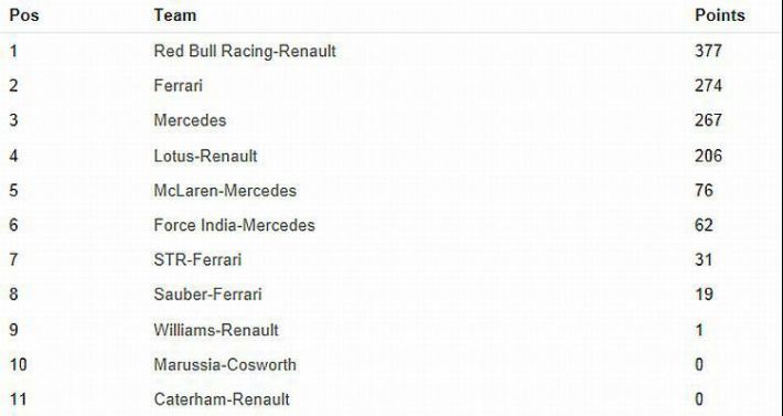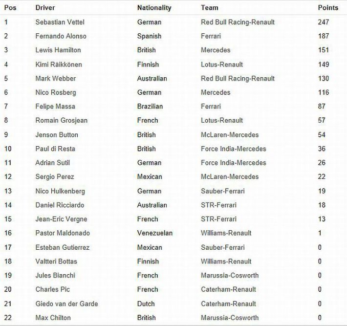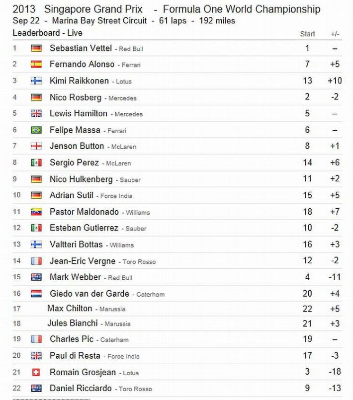 Vettel je u velikom naletu. Ostvario je još jednu sigurnu pobjedu na Velikoj Nagradi Singaporea…drugi Alonso, treći Raikkonen…. Smiješi se novi naslov prvaka za Sebastiana Vettela. U Singaporeu je ostvario još jednu pobjedu, još jedan korak ka novom naslovu svjetskog prvaka. Vodio je od početka do kraja. Ineteresantnije je bilo iza njegovog „repa“. Na kraju je Alonso uspio osvojiti drugo mjesto, mada prije utrke nije bio zadovoljan sa svojim bolidom. Izgleda da uspjeva izvući iz Ferraria maksimum u ovom trenutku. Isto tako sjajnu utrku odvezao je Raikkonen koji se ka vrhu probijao sa jedanaeste pozicije. No, uporni Finac je na kraju uspio dovesti do postolja. Tragičar utrke svakako je Mark Webber. Nije izdržao do kraja, morao je zbog kvara uzrokovanim problemima sa mijenjačem odustati krug prije kraja.. Iduća utrka vozi se u Koreji za dva tjedna…