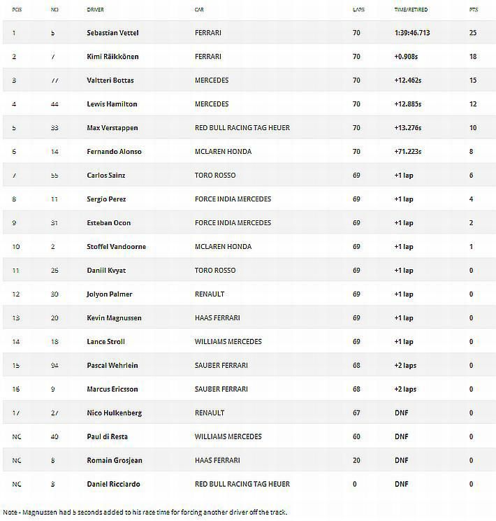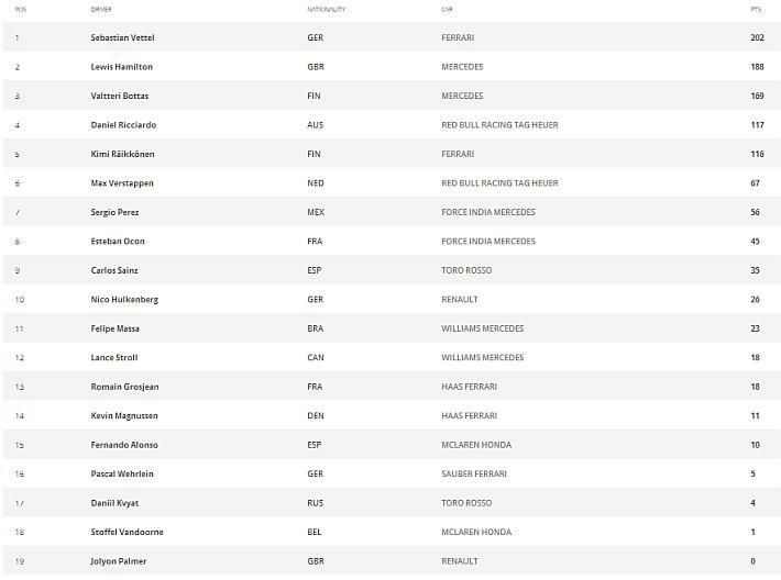 Nakon što je Ferrari nadmašio Mercedes u kvalifikacijama, isto se ponovilo i na utrci za VN Mađarske na trkalištu Hungaroring. Sebastian Vettel (Ferrari) bio je najbrži u kvalifikacijama i krenuo je s prve startne pozicije u utrku za Veliku nagradu Mađarske na stazi Hungaroring. Sebastian Vettel (Ferrari) pobjednik je 11. utrke sezone u Mađarskoj, a prve dvije pozicije sa starta Ferrari je pretvorio i u prva dva mjesta na utrci, jer je Vettelov momčadski kolega Kimi Raikkonen utrku završio drugi. Isti poredak sa starta bio je i između trećeg i četvrtog Mercedesa s time kako je treći završio Valtteri Bottas, a njegov momčadski kolega Lewis Hamilton završio je četvrti. Na sporom Hungaroringu Ferrari je dominirao nad Mercedesom. Ulazilo se u boks samo jednom i tada je Hamilton bio brži od Bottasa pa je Mercedes naredio da zamijene pozicije kako bi Hamilton pokušao napasti Raikkonena. Kako Hamilton nije mogao ništa Raikkonenu u posljednjem zavoju je vratio poziciju Bottasu. Vettelu je ovo četvrta pobjeda u sezoni, a tek druga u Mađarskoj nakon 2015. Ovom pobjedom Vettel je prednost ispred Hamiltona povećao na 14 bodova, devet utrka prije kraja sezone. Moramo još istaknuti Fernando Alonsa, koji se bori u McLarenu sa Honda motorom, i ovaj put ga pohvaliti kako je utrku završio visoko pozicioniran čak na šestom mjestu, a može se i pohvaliti i s najbrže odvezenim krugom na utrci. Iduća utrka za VN Belgije vozi se za četiri tjedna.