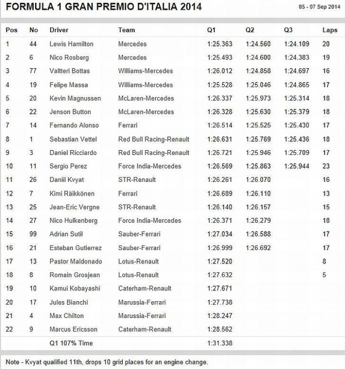 REZULTAT KVALIFIKACIJE ZA VN ITALIJE – MONZA: