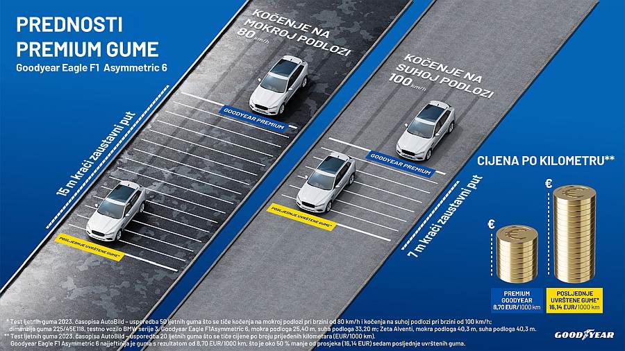 Njemački automobilistički časopis Auto Bild usporedio je potencijal dvadeset ljetnih guma i na prvo mjesto uvrstio premium gumu Goodyear Eagle F1 Asymmetric 6 s 63.200 prijeđenih kilometara, što je više nego dvostruko više nego što je izdržala guma uvrštena na posljednje mjesto. Auto Bild usporedio je i cijenu dvadeset ljetnih na 1000 prijeđenih kilometara, gdje se također najjeftinijom pokazala upravo guma Goodyear Eagle F1 Asymmetric 6 s 8,70 eura na 1000 km. To je približno upola manje od prosječne cijene posljednjih sedam uvrštenih guma na 1000 prijeđenih kilometara, koja je iznosila 16,15 eura.ii Drugim riječima, sa spomenutom gumom (do zakonski dopuštene istrošenosti gaznog sloja) postignuta je tolika kilometraža da je preračunato prema cijeni nadmašila svu konkurenciju različitih guma.