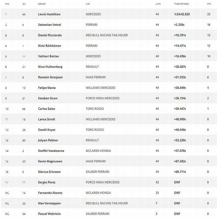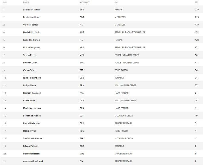 Ovogodišnju utrku na legendarnoj stazi Spa-Francorchamps za VN Belgije osvojio je Hamilton u Mercedesu. Hamiltonu je to treća pobjeda na stazi Spa-Francorchamps. Hamiltonu je to pak peta pobjeda u ovogodišnjoj sezoni, a kako je Vettel u Ferrariju na cilj došao drugi u ukupnom poretku Hamilton je smanjio zaistatak za vodećim Vettelom na samo sedam bodova. Hamilton je startao sa pole positiona i prvo mjesto nije puštao sve do kraja utrke, a bilo je gusto jer je cijelo vrijeme Vettel bio iza njega sa zaostatkom od samo dvije sekunde. Vettel je pokusao sve, pa i korištenje super mekanih guma, ali Hamilton je bio brži. Treće mjesto na pobjedničkom podiju osvojio je Ricciardo u Red Bullu, dok je Raikkonen u Ferrariju završio četvrti jer je dobio kaznu od 10 sekundi mirovanja u boksu koju je dobio zbog prebrze vožnje pod dvostrukim žutim zastavama. Start Alonsa bio je dobar i probio se na sedmo mjesto, ali tijekom utrke su ga prestizali drugi brži bolidi, a na kraju je Alonso odustao zbog kvara na motoru. Iduća utrka vozi se za tjedan dana u Monzi.