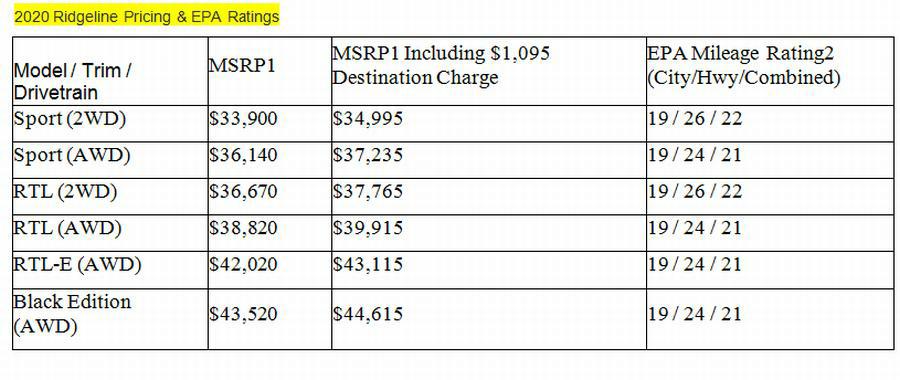 Osvježeni Honda Ridgeline 2020. Stigao je u prodaju od sredine prosinca 2019. s nizom nadogradnji, uključujući standardni 9-stupanjski automatski mjenjač, Honda Sensing sigurnosnu i vozačku pomoćnu tehnologiju. Sada je dostupan u četiri izvedbe – Sport, RTL, RTL-E i Black Edition. Ridgeline 2020 stiže s početnom cijenom od 33.900 dolara (bez 1.095 dolara za dostavu) za Sport trim s pogonom na dva kotača.