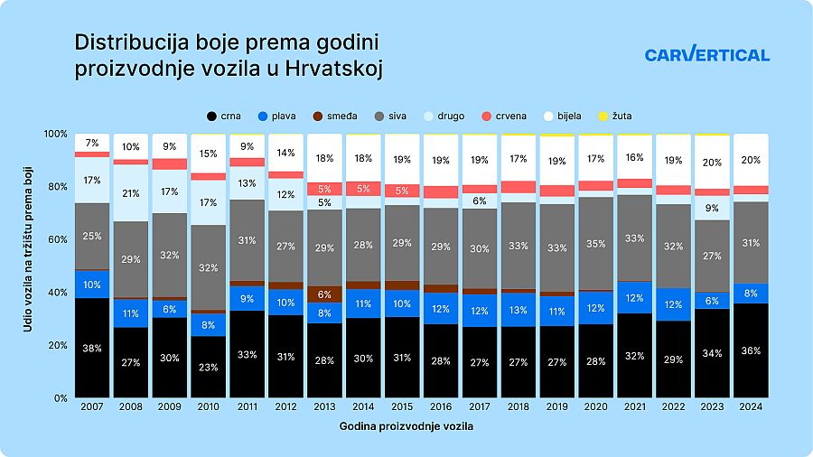Proizvođači automobila nude širok izbor boja za svačiji ukus – od provjerenih monokromatskih nijansi do odvažnih nijansi koje privlače pažnju prolaznika. Međutim, stručnjaci naglašavaju da kupci rabljenih automobila imaju malo drugačije prioritete pri odabiru rabljenog vozila. Istraživanje koje je tvrtka za podatke o vozilima carVertical provela po drugi put otkriva da hrvatski kupci automobila ne žele da se njihova vozila ističu, pa izbjegavaju jarke boje. Hrvatski vozači nisu skloni odabiru automobila jarkih boja i više vole jednobojne tonove. Od svih vozila koje je carVertical provjerio 2024. godine, 30,8% bila su siva, 35,8% crna, 19,7% bijela, 7,5% plava i 3,2% crvena.