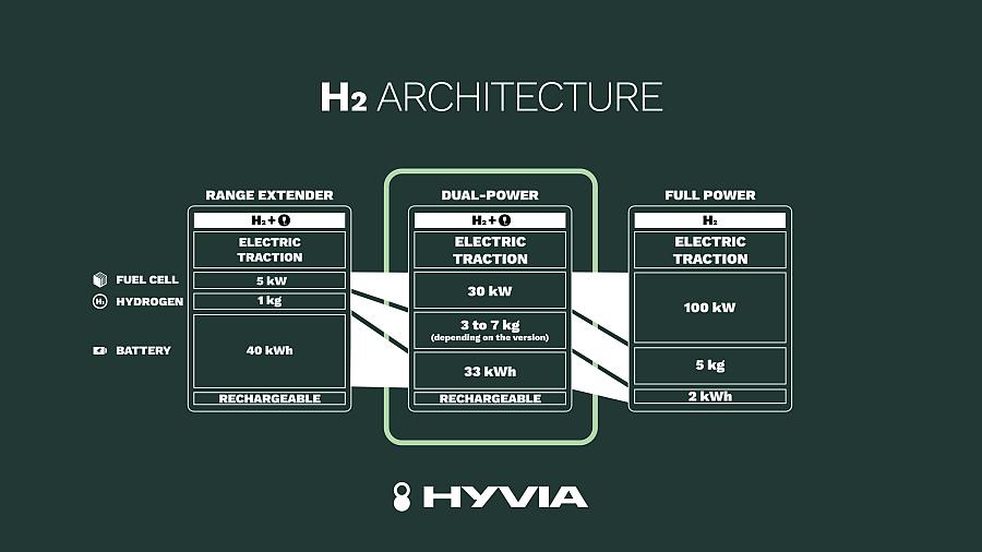 Ova se vozila temelje na arhitekturi Dual Power: imaju i električni pogon i pogon na vodik. Doseg do 500 km: od toga 100 km na električni pogon, a ostatak na vodik. Svi su opremljeni baterijom kapaciteta 33 kWh, gorivnim člankom snage 30 kW i spremnicima vodika kapaciteta od 3 do 7 kg, ovisno o inačici. Sustavi gorivnih članaka uključuju i sklop i sve podsustave potrebne za dovod zraka i vodika, te njihovu regulaciju, ovlaživanje i rashlađivanje.