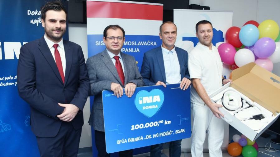 Donacijom Općoj bolnici „Dr. Ivo Pedišić“ u Sisku, INA je zatvorila još jednu godinu pomaganja hrvatskim bolnicama. Damir Butković, direktor Rafinerije nafte Sisak, uručio je ravnatelju bolnice mr. sc. Tomislavu Dujmenoviću, dr. med. ček u iznosu od 100.000 kuna, a sredstva će se upotrijebiti za nabavku fleksibilnog videoureteroskopa za razbijanje kamenca u mokraćnom mjehuru i mokraćovodu. Uz službeni dio, male pacijente s Odjela pedijatrije razveselili su predstavnici Hrvatske vaterpolske reprezentacije koji su im podijelili prigodne poklone. U posljednjih 10 godina, INA je za razvoj i opremanje hrvatskih bolnica donirala više od 5 milijuna kuna, a samo u 2019. donirano je 800.000 kuna zdravstvenim ustanovama. Uz današnju bolnicu, INA je pomogla i Specijalnoj bolnici za kronične bolesti dječje dobi Gornja Bistra, Klinici za plućne bolesti Jordanovac, Klinici za dječje bolesti Zagreb te Kliničko bolničkim centrima u Osijeku i Splitu.