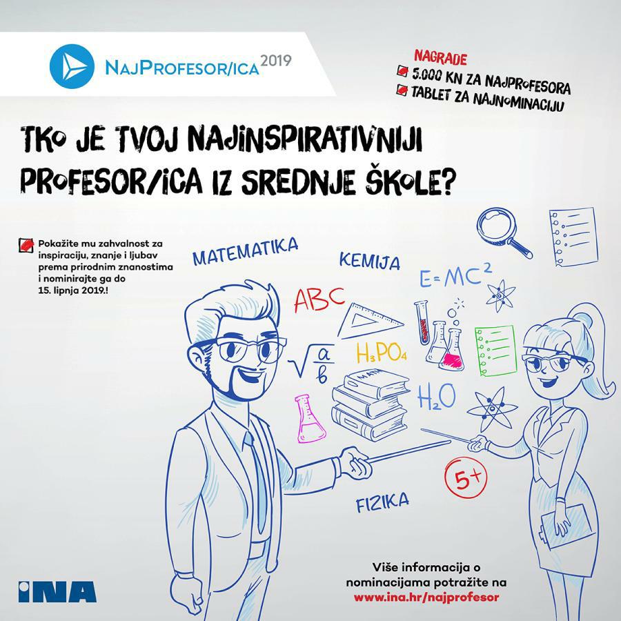 INA poziva studente da odaju priznanja najboljim srednjoškolskim profesorima kroz natječaj NajProfesor/ica. Kompanija osmu godinu zaredom daje priliku studentima da nominiraju srednjoškolske profesore koji su im ostali u posebnom sjećanju. Prijave na ovogodišnji natječaj otvorene su do 15. lipnja na http://www.ina.hr/najprofesor. INA je pokrenula osmi po redu natječaj NajProfesor/ica u sklopu kojeg studenti imaju priliku nominirati profesora ili profesoricu iz srednje škole koji su u njima potaknuli želju za učenjem i napredovanjem te usadili ljubav prema prirodnim znanostima.