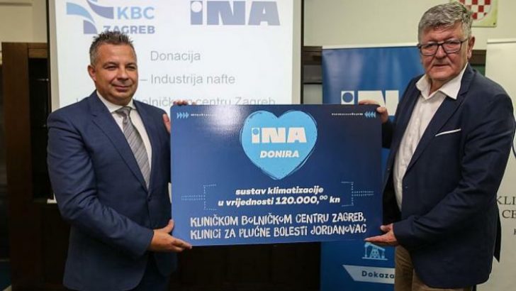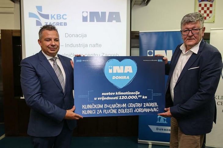 Inina donacija u iznosu od 120 tisuća kuna koju je prof.dr.sc. Anti Ćorušiću, ravnatelju Kliničkog bolničkog centra, uručio g. Zoltán Áldott, predsjednik Uprave Ine, omogućit će KBC-u Zagreb zamjenu dotrajalog sustava klimatizacije u Klinici za plućne bolesti Jordanovac. Osim ove, INA je pripremila donacije za još šest bolnica diljem Hrvatske koje će uručiti do kraja godine. G. Áldott tom je prilikom izjavio: „Suradnja s KBC Zagreb na neki način je postala tradicija te me veseli što je INA i ovom prilikom doprinijela boljim uvjetima rada i liječenja na Klinici Jordanovac gdje se brinu o pacijentima iz cijele Hrvatske. Pomaganje zajednici u kojoj djelujemo u samoj je srži Ininog poslovanja, a ovo je prva od sedam donacija bolnicama koje će INA uručiti do kraja godine kako bismo pomogli onima kojima je to najpotrebnije.“