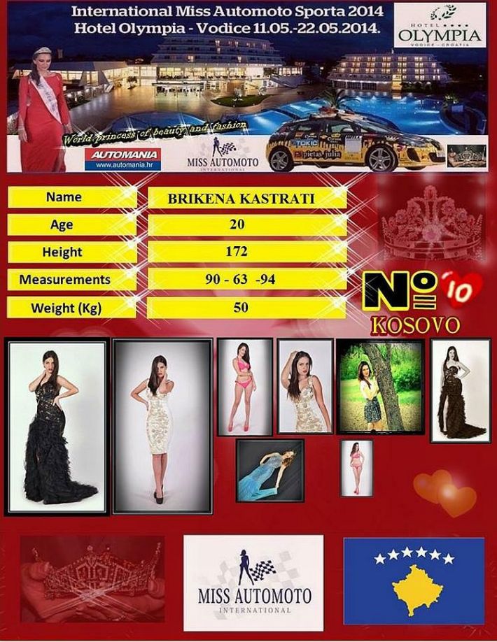Deseta kandidatkinja je BRIKENA KASTRATI iz Kosova koja ima 20 godina, visoka je 172 cm, težine 50 kg i ima mjere 90-63-94. U nastavku pogledajte fotografije desete kandidatkinje 'International Miss Automoto sporta 2014.'…