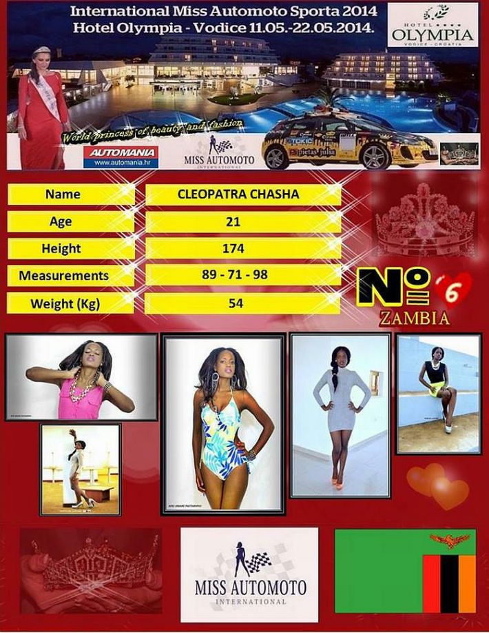 Šesta kandidatkinja je CLEOPATRA CHASHA iz Zambije koja ima 21 godinu, visoka je 174 cm, težine 54 kg i ima mjere 89-71-98. U nastavku pogledajte fotografije šeste kandidatkinje 'International Miss Automoto sporta 2014.'…