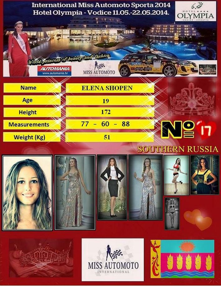 Sedamnaesta kandidatkinja je ELENA SHOPEN iz Južne Rusije koja ima 19 godina, visoka je 172 cm, težine 51 kg i ima mjere 77-60-88. U nastavku pogledajte fotografije 17. kandidatkinje 'International Miss Automoto sporta 2014.'…