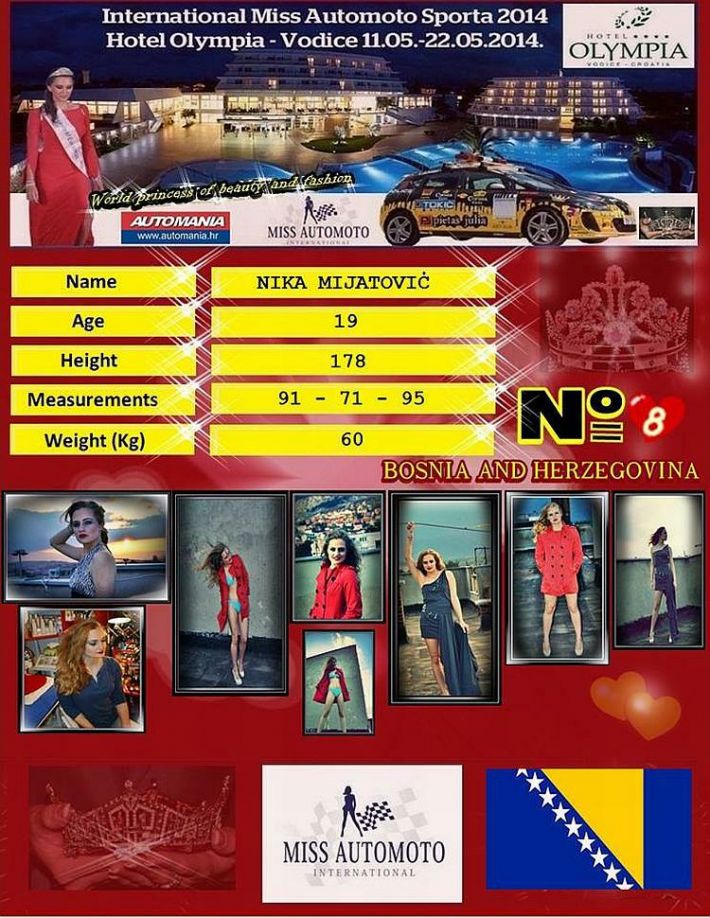 Osma kandidatkinja je NIKA MIJATOVIĆ iz Bosne i Hercegovine koja ima 19 godina, visoka je 178 cm, težine 60 kg i ima mjere 91-71-95. U nastavku pogledajte fotografije osme kandidatkinje 'International Miss Automoto sporta 2014.'…