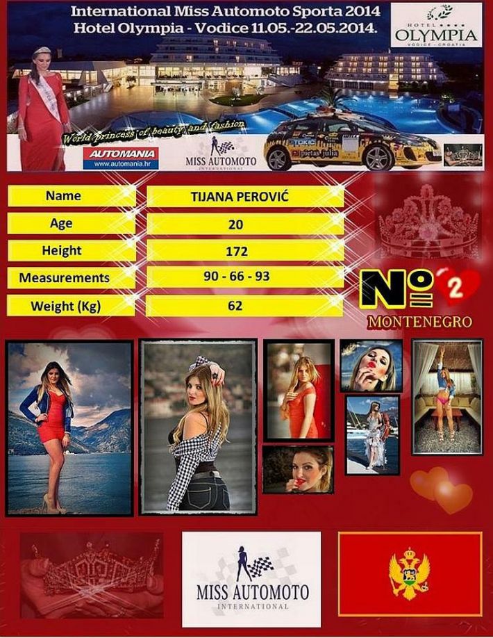 Druga kandidatkinja je Tijana Perović iz Crne Gore koja ima 20 godina, visoka je 172 cm, težine 62 kg i ima mjere 90-67-93. U nastavku pogledajte fotografije druge kandidatkinje 'International Miss Automoto sporta 2014.'…